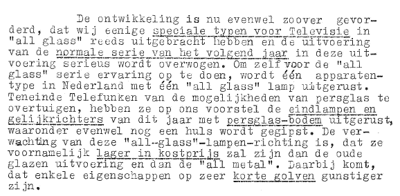 The development of the all-glass valve has now advanced to such a state that several special valves for television have been introduced, while the introduction next year, of the normal valve series [for radio] in this envelop is seriously being contemplated. In order to gain some experience with the all-glass valve, one receiver type in Holland will be equipped with a single all-glass valve. In order to convince Telefunken of the possibilities of pressed glass, they have fabricated amplifier tubes and rectifiers with a pressed-glass base, underneath which still a normal socket was cemented. It is expected that the all-glass valves will be significant cheaper than the traditional glass valves and metal valves. Additionally, they have better properties for short waves.