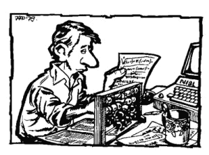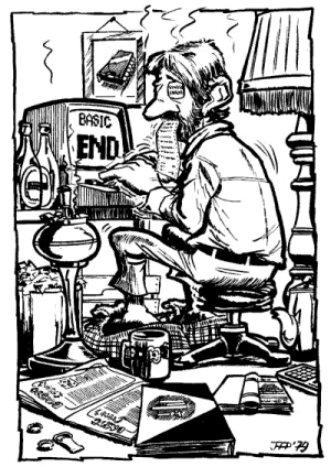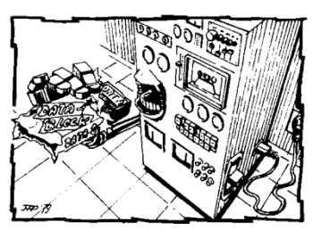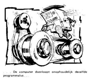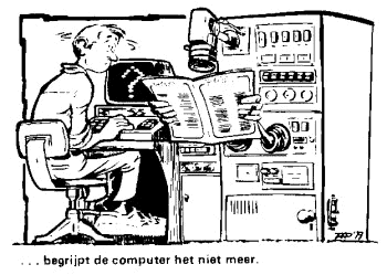 A machine like the PET or the TRS80 (from Radio Shack) were for beyond the financial means of my parents. It is therfore not difficult to understand my excitement when the electronic magazine Elektuur (Elektor) in 1979 published a Tiny-BASIC interpreter for my SC/MP called NIBL. Around the same period they started a series of monthly tutorials on the BASIC language. The cartoons on this page have been taken from these tutorials. The next few years were spend building a system that would run the NIBL interpreter. It became so to speak the end goal of all my hobby efforts. Remember that I was sixteen with allmost no budget and that it was 1979. I finally succeeded but it never worked very well and by the time I had it working it already had become easier to get access to real computers so I kind of lost interest in the NIBL interpreter.