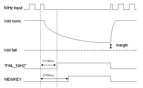 Figure 31 Timing diagram showing how the “FAIL_50HZ” and “NEWKEY” flags relate to the 50 Hz mains frequency.