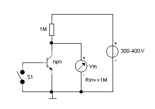 Similar to avalanche breakdown in a diode, avalanche breakdown in a transistor is also non-destructive, provided that the dissipation in the dissipation transistor does not exceed the maximum specifications. This fact can be used to measure the BVceo in a very simple way. In Fig. 18 the npn transistor to be tested is forced into avalanche breakdown by the high-voltage power supply. Assuming a breakdown voltage in the order of 100V, the resistor limits the avalanche current to something in the order of 0.1-0.3mA. This limits the dissipation to a safe value of less than 50mW. The BVceo is now simply the voltage drop across the transistor. In order not to influence the measurement, a multi-meter with a resistivity much higher than 1M has to be used for this method.