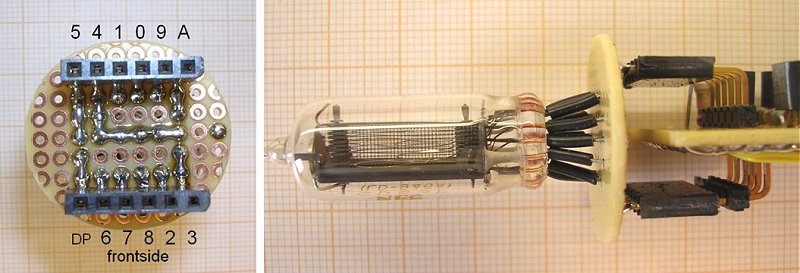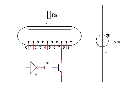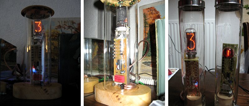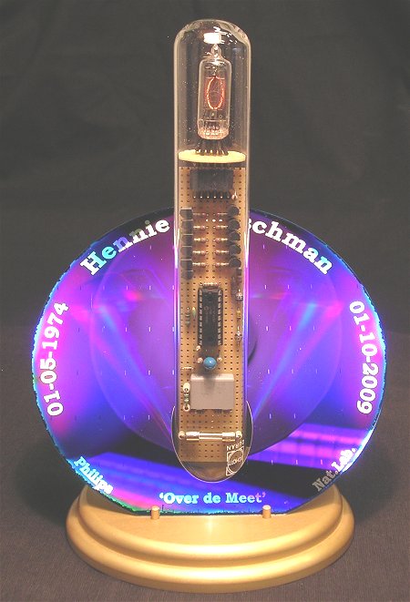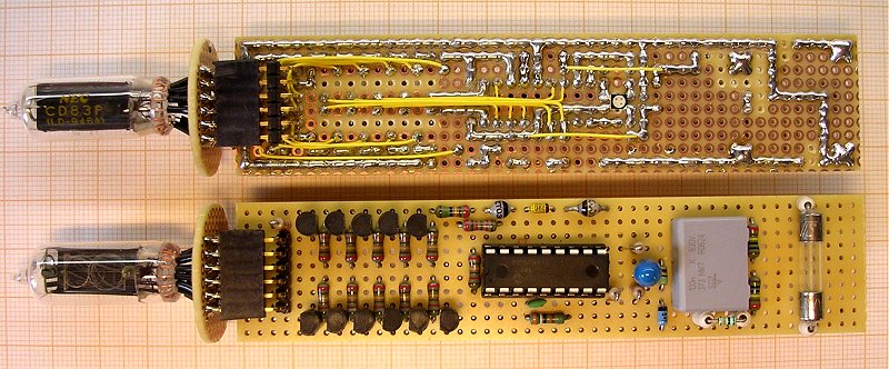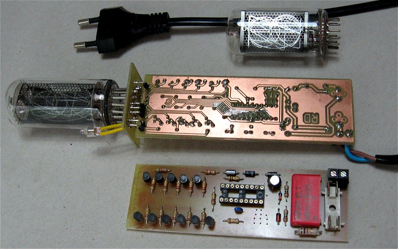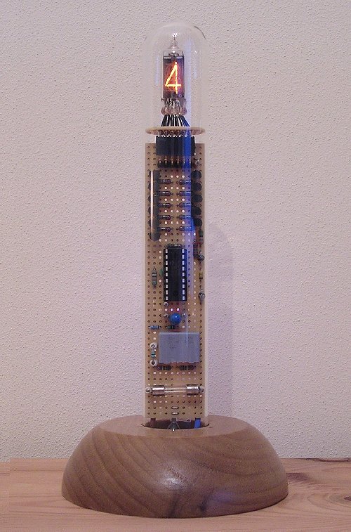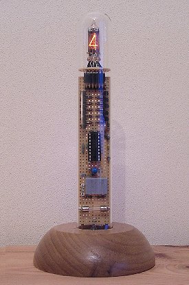 I did not agree with him. According to my opinion it was possible to make a very simple nixie clock without any difficult components. Obviously, I had to prove this statement by demonstrating it. As it happened, I had just finished a single digit clock for my eldest son, and now my youngest son Daan, was begging me if I could also build one for him. The clock described on this page is the result of both events, a simple single digit nixie clock with some interesting features, but without any difficult components.