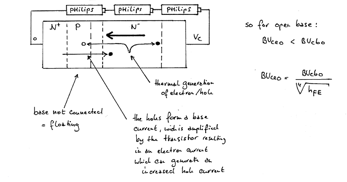 In reality a transistor is not just a series connection of two diodes back-to-back, rather the junctions have been carefully arranged so as to yield a current amplifying device! Fig. 17 shows a bipolar transistor under reverse bias with open base. Since the collector-base junction is reverse biased, most of the applied voltage between the collector and emitter will drop over the collector-base junction. In this junction electron-holes paires will be generated as discussed before. The electric field in the junction will accelerate the electrons towards the collector contact where they will contribute to the leakage current. The holes however, will be accelerated towards the base. On arrival in the base, the holes have nowhere to go, since the BVceo is measured with open base. As a result the base will be charged, and the transistor will be switched on resulting in a large emitter current. A more exact description is: “the holes generated in the collector-base junction are, after arrival in the base, injected in the emitter, resulting in an electron current of hFE times the hole current.” In other words, the transistor is amplifying its own leakage current. What it boils down to is that the BVceo is reduced with respect to the BVcbo by a factor depending on the DC current amplification (Fig. 17).