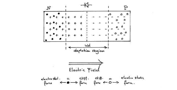 Before continuing, it is important to realize that in a silicon lattice there are only two forces that can make an electron or a hole move. When an electric field is applied over the crystal, the positively charged holes will start to move into the direction of the field, while the negatively charges electrons will move in the opposite direction. This force is called drift of carriers in an electric fiels. The second force is called “diffusion”. In a silicon lattice, carriers will tend to move from a location where there is a high concentration to a location with a lower concentration, eventually resulting in a homogeneous distribution. The intricate interplay between drift and diffusion in semiconductors determine their electrical behavior.