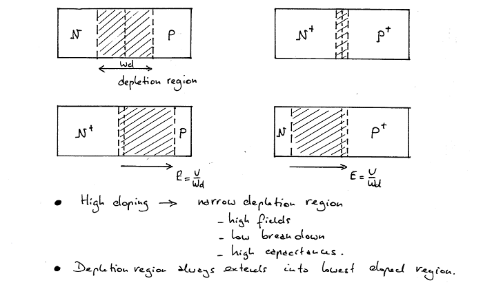 The maximum electric field in a junction is not only determined by the applied reverse bias, it also depends, as we have seen, on the width of the depletion region. A lower doping concentration results in a wider depletion region and thus in a lower field. Diodes with high breakdown voltages therefore have at least one lowly doped region. The price is of course series resistance when the diode is forward biased. Designing a diode (or transistor) is always a matter of carefully balancing tradeoffs.
