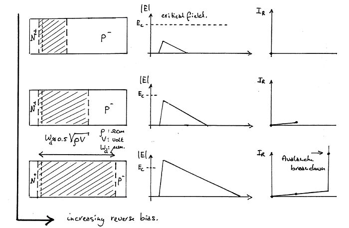 Figure 10 schematically depicts what happens inside a junction when the reverse bias is gradually increased. In this example the n-type side of the junction is more heavily doped (denoted by the n+) than the p-type side (denoted by the p-). As we have seen, the depletion region mainly extends into the lowest doped region. The top row represents the situation when no reverse bias is applied. The middle figure in the top row shows the electric field in the junction. Obviously, the current through the junction is zero in this situation. When a reverse bias is applied (middle row Fig. 10) the depletion region widens, mainly into the lowest doped region. At the same time the maximum electric field in the junction increases. As a result of the thermal generation of carriers, there is a small leakage current flowing through the junction. Although the statistical process of thermal generation of carriers is bias independent, the leakage current nevertheless increases for increasing reverse bias. This is caused by the fact that as the depletion region widens, the volume in which carriers can be generated increasing, resulting in an increase of leakage current.