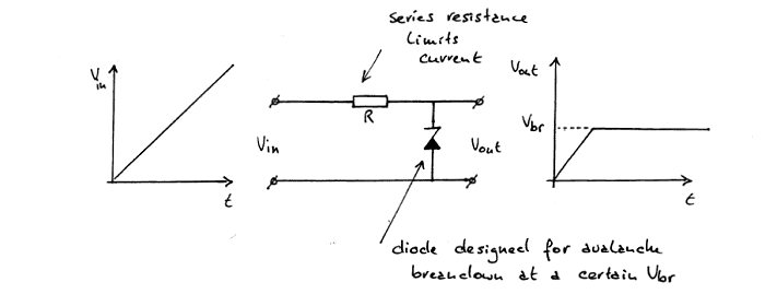 It is important to realize that avalanche breakdown in a diode is by no means a destructive! When the reverse bias is reduced again, the diode will recover from the breakdown without any damage, provided that the dissipation in the diode is limited to such a value so that the diode is not damaged due to overheating. In fact avalanche breakdown determines the working voltage of all zener diodes for voltages of 4.7V and higher. Figure 12 depicts how a zener diode can be used a voltage reference. When the input voltage of the circuit is increased, the zener diode, which is nothing else than a normal diode engineered to yield a breakdown at a very specific value, breakdown. The resistor is added to limit the current and thus the dissipation (I*Vbr). Since the I-V curve of te avalanche breakdown is so very steep (Fig. 11 right), the output voltage will be constant over a large range of the current.