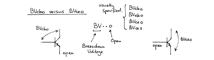 In a diode we only had to deal with one breakdown voltage. In a transistor we have at least two junctions, so we can have a reverse breakdown of the emitter-base junction and of the collector-base junction. These breakdown voltages are usually denoted by something like: BVebo. “BV” Obviously stands for Breakdown Voltage, “eb” specifies emitter-base junction, while the “o” means that the breakdown voltage has been measured with the third terminal, the collector, open (not connected). Similarly BVcbo gives the the breakdown voltage of the collector-base junction with open emitter.