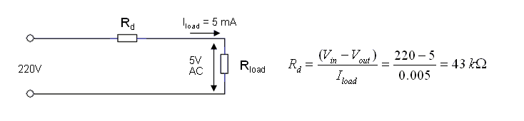 The simplest way to reduce the 220V mains voltage to something like the 5V needed to power the micro-controller and some peripheral logic, is to simply drop the voltage surplus over a suitable series resistor (Fig. 21). The biggest drawback of this solution is obviously dissipation. Even if we assume that the total circuit would not consume more than 5mA, this will result in a dissipation of (220-5)*0.005=1.075W. Considering the fact that the circuit itself dissipates only 0.005*5=0.025W, the efficiency of this power supply would be something like 2%, which is, apart from the problems associated with the generated heat, an absolute waste of power.