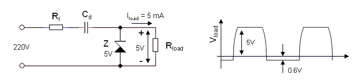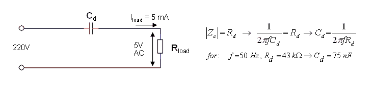 A much more sensible solution is to replace the resistor by a suitable capacitor. Looking at Fig. 22, we observe that the circuit basically has become a low-pass filter, which is dimensioned in such a way that only just enough current passes to cause a voltage drop of 5V over the load, while the remaining 215V drops over the “dropping” capacitor. The beauty of this solution is that since the phase of the current through a capacitor is shifted 90 degrees with respect to the voltage across it, the dissipation in the capacitor will be zero. That is for an ideal capacitor, in reality every capacitor will have some series resistance, resulting in a very small dissipation. This however is nothing compared to the dissipation in a dropper resistor.