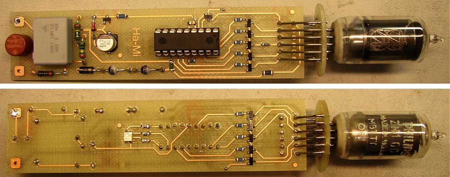 Guus Assmann from Holland built the tube-in-a-tube clock and he created a single layer PCB for it. He was so kind to offer his designs for download on this page. He designed two PCBs one for the IN18 and one for the ZM1020. The last tube has a top view so that the tube can be placed directly on the main PCB. The pins on the connector to the tube PCB are: anode,DP,9,4,5,6,7,1,8,2,3,0.