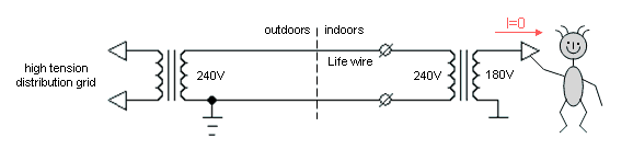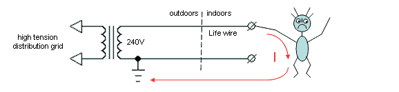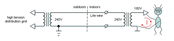 When no transformer is used, the circuit will always carry a deathly potential with respect to the real ground (Fig. 4). In this case a single touch to any part of the circuit will result in the flow of a current straight though your body to ground. This may very easily kill you! Note that in this case we have no way of knowing which terminal is connected to the live wire and which terminal is connected to the ground since this will depend on the position of the mains plug in the wall outlet. Consequently, we have no way of defining one of the terminals as a local ground. The only solution is to isolate the entire circuit!