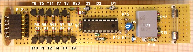 Figures 28 and 29 give an impression how the circuit for the clock was realized. The circuit is so simple that it can easily be built on a piece of breadboard in a few hours. Resistor R16 was mounted in such a way that it is thermally isolated from the PCB and its neighboring components. The reason for this is, that should by any chance capacitor C1 fail, that is breakdown and short-circuit, the complete mains voltage appears over R16. By thermally isolating it, it will become so hot that it will burn down, interrupting the current, without overheating the PCB or other components. The fuse only offers limited protection in such events.