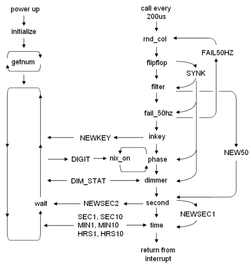 Figure 30 schematically depicts the program flow. The left part of the figure represents the main program, while the right part represents the interrupt service routine and its components. The most important variables which are used for communications between different parts of the program have been indicated in capitals. The first part of the program consist of the initialization of the processor (setting of interrupts, configuring timer etc.) and of the program variables. In the next part the time is set in the way described above. Then to program enters an endless loop in which the time is displayed digit by digit. This is done by loading the value of the digit to be displayed in variable “DIGIT” and making “DIM_STAT=1” to signal the “DIMMER” routine, which actually takes care of the on- and off-fading of the nixie, that there is a new digit to be displayed. The main program then uses the wait routine to wait for the beginning of a new second.