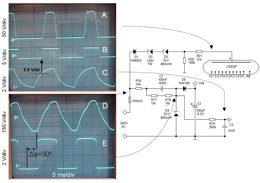 The high- and low-voltage supply circuit together with its associated waveforms are shown in Fig. 26. The high voltage supply is basically nothing more than the single sided rectified mains voltage without any smoothing. Zenerdiodes D2 and D3 lower the peak mains voltage to ca. 240V (Fig. 26A), well below the combined breakdown voltage of 270V, of the BC550 and the nixie. Although the nixie tube switches on and off 50 times per second, the eye perceives it continuously on.
