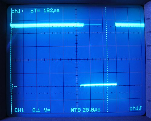 Altogether, this is quite a lot of work for the processor to do within the 200us interval between interrupt calls, especially since the processor is running on the internal 4MHz clock. To verify that the processor is able to finish these tasks before a new interrupt occurs, a simple trick is used. At the beginning of the interrupt service routine bit 5 of PORTB is set, the bit is cleared just before the return from interrupt. By observing PORTB,5 on the scope we get an idea of the duration of the interrupt routine (Fig. 32). Obviously, the length of the routine depends on what needs to be done. From Fig. 32 we learn that the average length of the routine is approximately 135us. However, also longer periods occure. The longest period I could detect is marked by the cursor at 182us, just within the 200us.