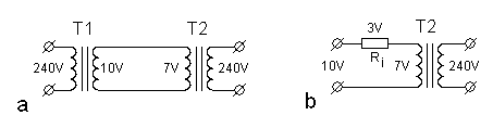 between T1 (10V) and T2 (7v) is explained by considering the resistive losses in T2.