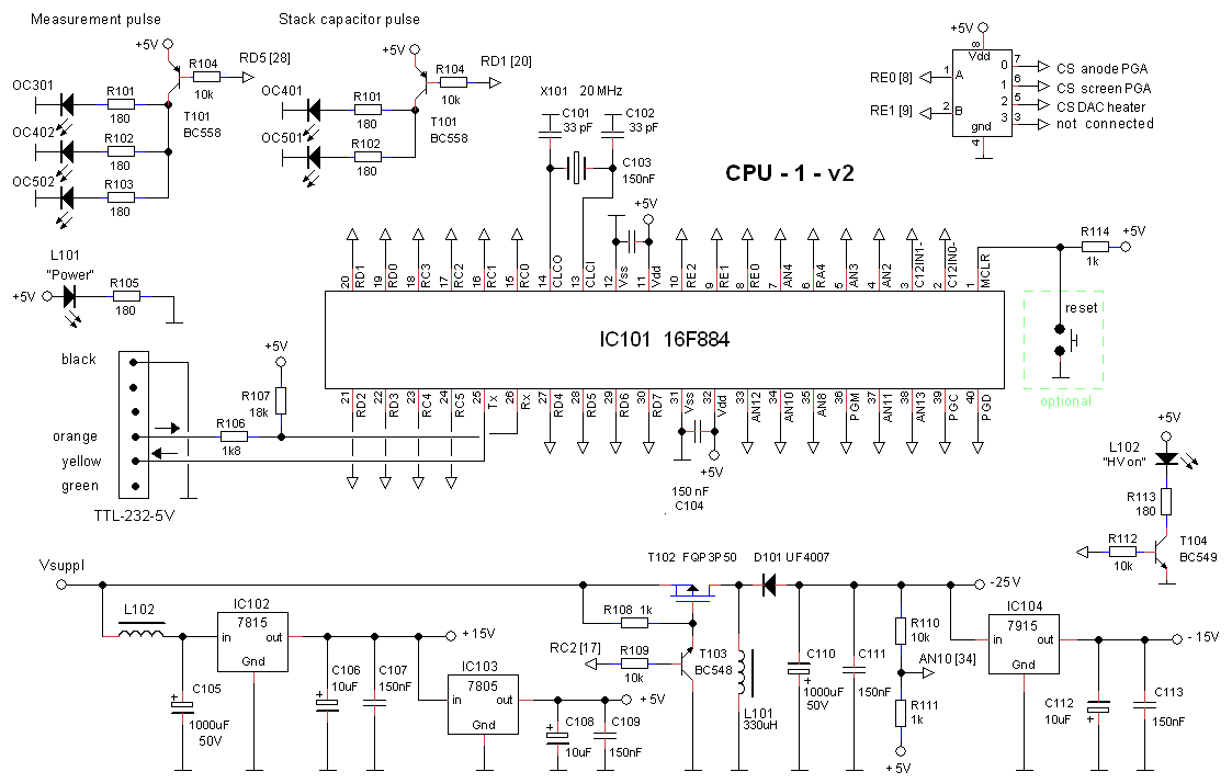 Since in the uTracer 5 the three LEDs in the opto-couplers for the anode, screen and bipolar grid supply need to be driven simultaneously by the same PIC I/O, a buffer transistor has been added to make sure there is enough driver power. A small 2 to 4 decoder was used to decode the chip-select signals for the two PGA’s and the DAC. This solution, though it requires an additional SMD component, saves one scarce I/O pin. Should in the end turn out that there is an I/O pin left then this decoder can be omitted.