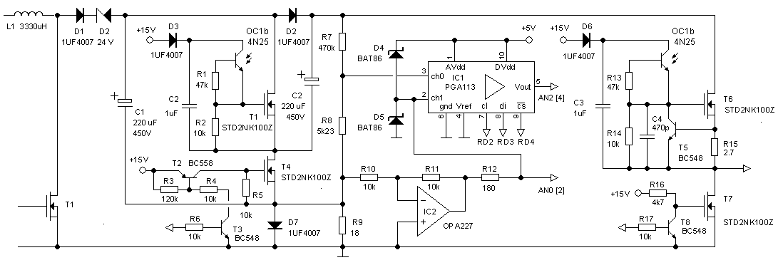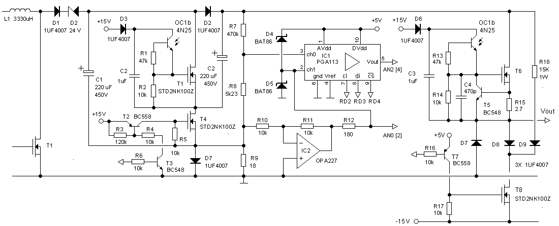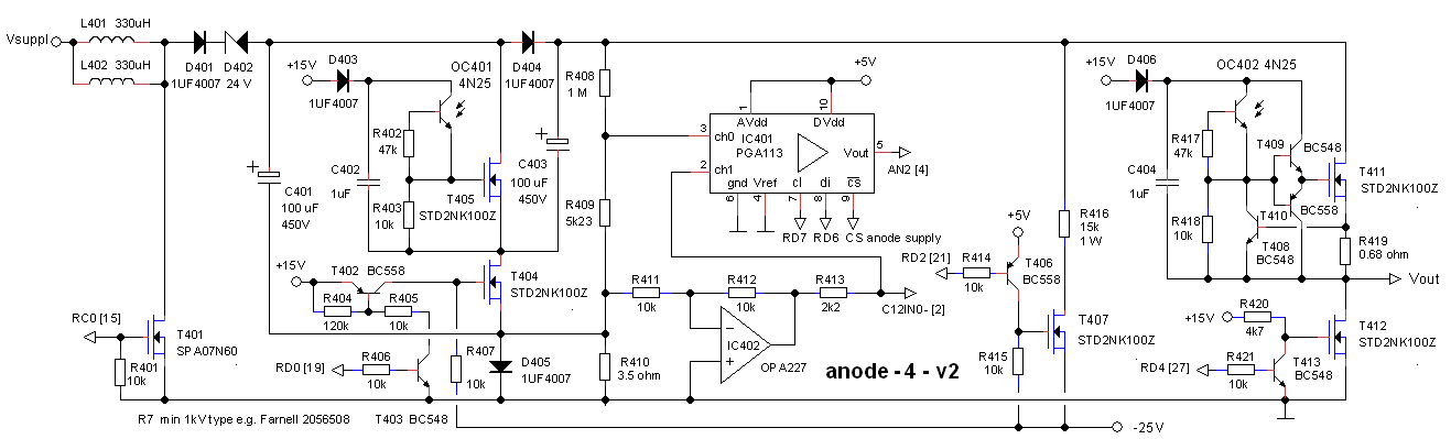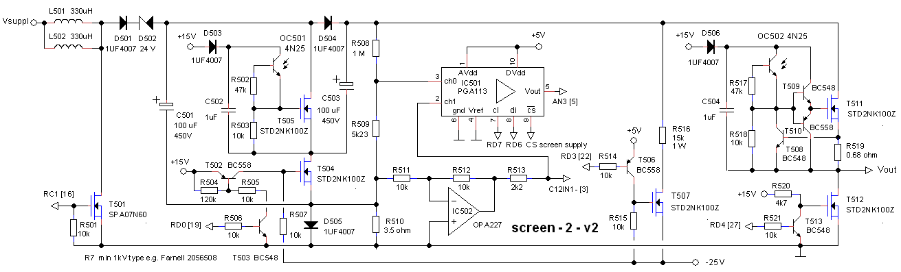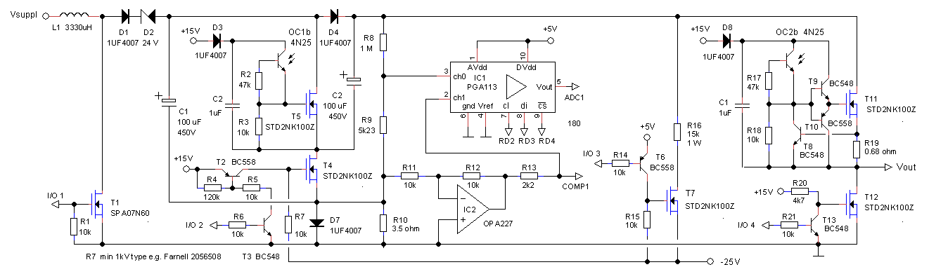 Figure 4.7 shows the updated version of fig. 3.7. With respect to fig. 3.7 the negative supply voltage has been decreased to -25 V, and the gate-sink resistor R7 has been connected to –25 V instead of to ground. The Schottky protection diodes D5 and D6 have been removed while resistor R13 (fig. 4.7) has been increased to 2k2 so that we can rely on the protection diodes at the input of the PGA113.