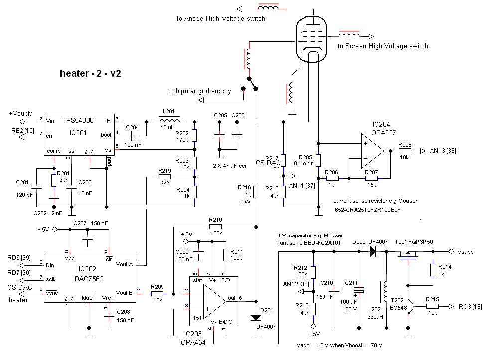A detailed description of the Buck converter heater supply can be found on the Lab Notebook Page. However, in the final design I selected a different DA converter namely the DAC7562 from TI. This IC has two separate 12 bit (!) DA converters including on-board reference, and uses a single SPI interface. One DA converter is used for the heater, the other for the negative grid supply. The output voltage of the DA converter can be programmed to values between true zero and Vdd (5 V). With the component values given in the circuit diagram the heater voltage can be set to any voltage ranging from 1.1 to 13.5 V.