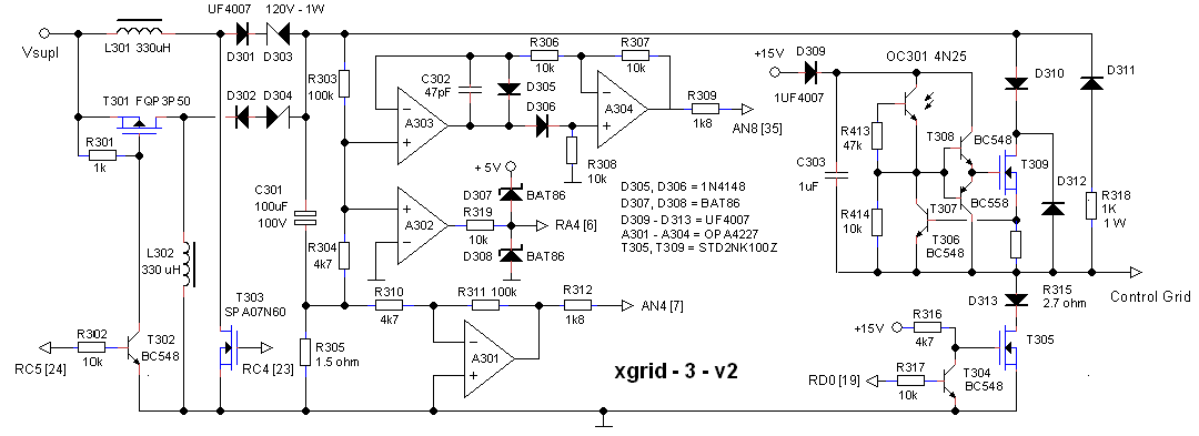 Whereas in the uTracer 3 one of the PWM outputs of the PIC was used in combination with a low pass filter to control the grid bias, here the second output of the DAC is used. This not only required less components, but also frees an I/O pin of the PIC since the second DAC is also controlled through the same SPI bus! The DAC drives the OPA454, a low-cost 100 V OpAmp, that is used as a -10x amplifier so that the 0 to 5 V output range of the DAC is mapped to 0 to -50 V. The output of the OpAmp directly drives the control grid. A 1k series resistors in combination with a simple diode is used to protect the OpAmp against flash overs and to reduce/eliminate oscillations.