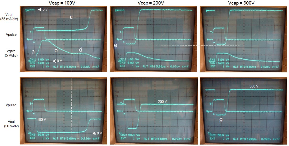 In Figure 2.2 the working of the switch in modes 2 and 3 is analyzed. For safety reasons the voltage is not pushed to the limit, but a maximum voltage of 300 V is used. The figure shows in three columns three different voltage setting: 100 V, 200 V and 300 V. The pictures in one column show different signals during the same measurement. The center trace in both pictures is the pulse signal that is also used to trigger the scope. In this case the pulse width is ca. 8 us. The upper trace in the top pictures shows the Vcur which is the voltage drop over Rsense. The lower trace in the top pictures shows the gate voltage of the NMOS. The bottom trace in the lower picture shows the output voltage. Because the switch circuit has been shifted to ground level, the output voltage is high in the off-phase and should approach zero in the on-phase.
