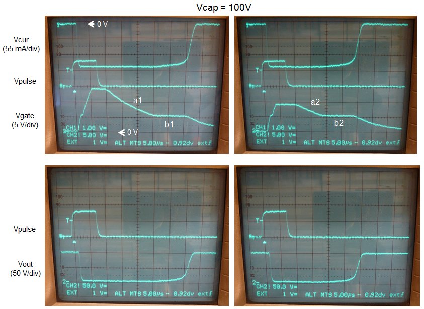 Figure 2.3 shows a similar set of curves as in Fig. 2.2 for a voltage of 100 V and a load resistor of 800 ohm (current limit circuit not activated). In the left column a gate voltage of 15 V is compared to a gate voltage of 10 V in the right column. By decreasing the gate voltages the discharging of the gate is significantly reduces (comp. a1 to a2 in Fig. 2.3) However, the plateau time remains the same (comp. b1 and b2). A gate voltage of 10 V seems optimal.