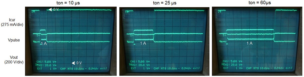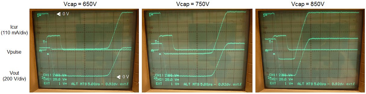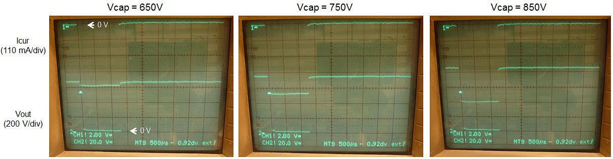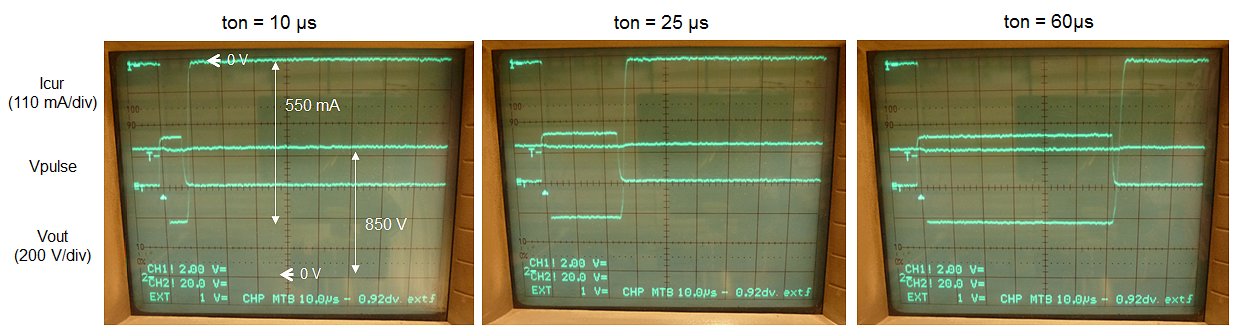In the second test Mode 2 and 3 operation is simulated with a mesurment pulse length of 10 us. A load of 1k5 is connected and the voltage is increased from 650 to 850 V (Fig. 2.5). At 650 V the hardware current limit circuit is not yet activated, the gate voltage of the MOSFET of 15 V, and the turn-off time is relatively long. At 750 V the current limit circuit is just activated and the pulse length is decreasing. At 850 V the current limit circuit is fully activated, the gate voltage is around the threshold and the turn-off time is minimal. The current is 550 mA.