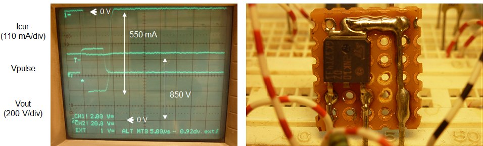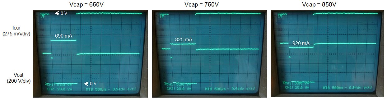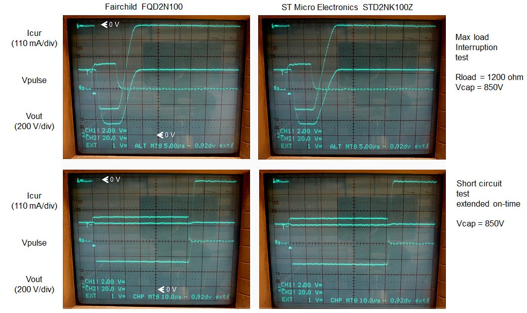 Finally a full short circuit test at maximum voltage (850 V)and maximum current (550 mA). Figure 2.6 shows how the tiny MOSFET handles an instantaneous dissipation of 425 W repeatedly without problems.