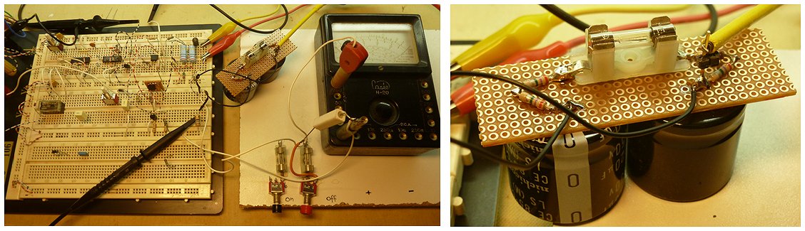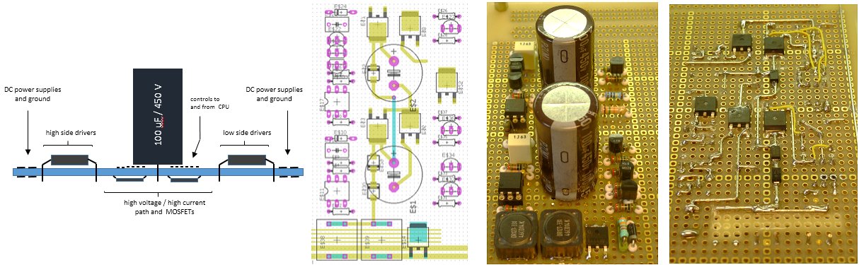 Figure 6.1 shows the circuit layout I arrived at. The schematic cross section and top view show that the circuit layout can be subdivided into three vertical columns. The left column contains the high-side driver circuits that operate at high voltages. They are the two “boots-strapped ”opto-coupler controlled MOSFET driver circuits. The middle column on the PCB contains on the bottom part of the PCB all the high current / high voltage wiring and all the high voltage MOSFETS. The top part of the PCB in that area is used to route all the control signals. They are kept at a safe distance from the high voltage driver circuits and the capacitor terminals. The right column, finally, contains the low-side driver circuits. The two photos on the right side show the perf-board implementation, without some of the control wiring. All in all a pretty small and compact piece of electronics.