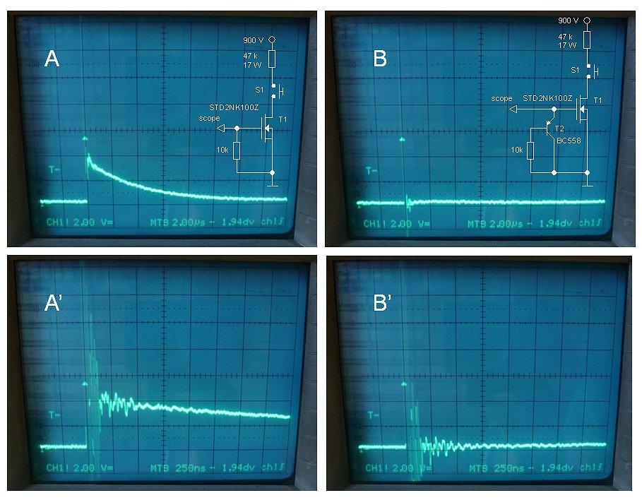 A simple experiment was used to get an qualitative idea of the impact of a buffer circuit on the dV/dt fenomenon. In Fig. 3.1A the drain of the MOSFET is connected via a push button and a current limiting resistor to a 900 V power supply. The signal on the gate of the MOSFET is monitored with a memory scope. When the switch is closed a transient appears om the gate. Figure 3.1A’ shows the same event on a different time scale. An extra transistor acting as an emitter follower almost completely suppresses the transient (Fig. 3.1B and B’). At t=0 there is in all cases a very large and very short spike that doesn’t decrease in amplitude when a buffer is used. I think is has nothing to do with the dV/dt effect but is just a measurement artifact.