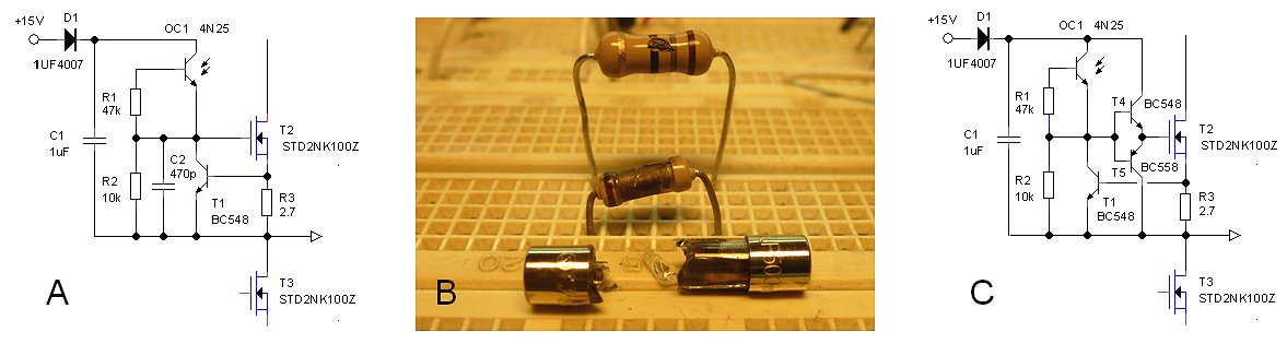 Figure 3.2 A) Original HV-switch circuit, B) collateral damage as a result of a dV/dt breakdown, C) new HV-switch circuit with gate driver.