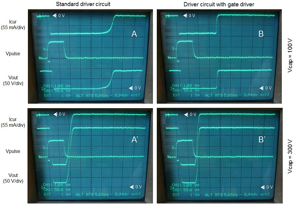 Figure 3.3 Switching behavior of the new HV-switch circuit compared to the standard circuit. Rload = 1 kohm