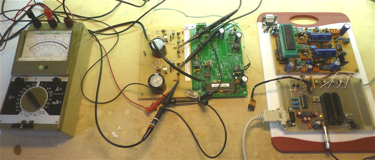 Figure 4.8 The test bench setup. From left to right: my reliable Unigor multimeter, the test bench itself with the new HV circuit on perfboard, and on the right my in-circuit PIC programmer + original uTracer3 circuit that I normally use to program and test PIC processors.