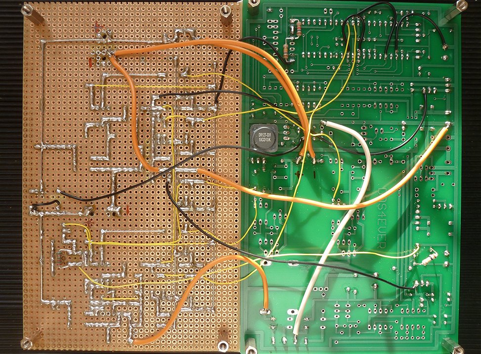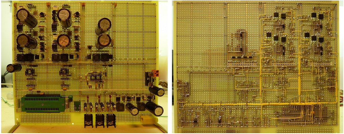 Time has come to make a first prototype version of the uTracer 5. At this point there were two options. Directly design a professional PCB for the circuit, or first construct a version on perf-board. Because the circuit is too big for a standard 10x16 (Eurocard) perf-board, I was very much tempted to go directly for the PCB version. However, that would require quite some time (and money) while it probably will need to be redesigned anyway. Personally I always prefer to first make a perf-board version. One way or the other it forces me to think about the optimal component placement, probably because it is very instructive to physically hold the components and move them around the board. Fortunately I could lay my hands on a large professional perf-board, so I decided to have a go at it!