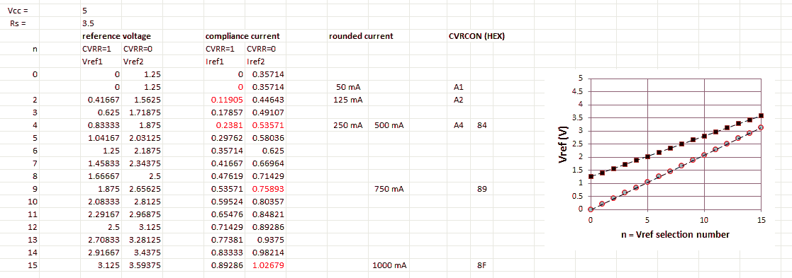 The selection of the proper value for the current sense resistor (R45 in Fig. 4.1) is a compromise. Ideally we want to select the resistance is high as possible for a maximum sensitivity and signal to noise ratio. In other words a voltage drop of 5V at the maximum current of 1 A, so 5 ohm. However, the voltage drop over this resistor is also used for compliance protection circuit where a comparator inside the PIC compares it with a programmable reference voltage also generated inside the PIC. Unfortunately the maximum voltage the programmable reference voltage source can generate is 3.6 V. For the current sense resistor therefor a value of 3.5 ohm is used. This will make it possible to set the compliance to 1 A. and additionally it is an commonly available resistor value. The programmable voltage source is rather an odd device that can generate, depending on the setting of a bit and a 4 bit value, a number of voltages. Figure 4.4 shows these voltages together with the corresponding compliance currents. From this list a number of settings more or less corresponding to the range: 50, 125, 250, 500, 750 and 1000 mA were selected. The values are not exact; that is not possible with such a simple solution or necessary either.