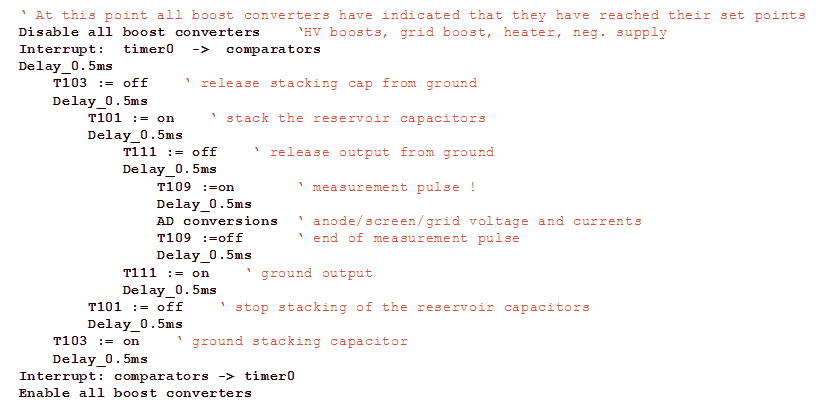 Although for “a real” version 5 the firmware will be thoroughly revised, it was fortunately possible to get the new HV-supply working with minimal modifications to the uTracer3 firmware. Most important was the addition of a number of I/O’s to control the MOSFET switches. The pseudo code in Fig. 4.3 shows how these control signals are generated. A measurement event starts with the stacking of the reservoir capacitors. This itself consists of two steps: release of ground to the stacking- and bootstrap
