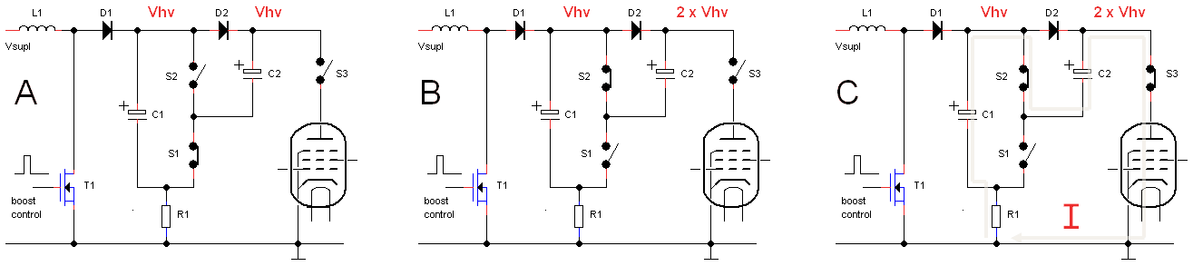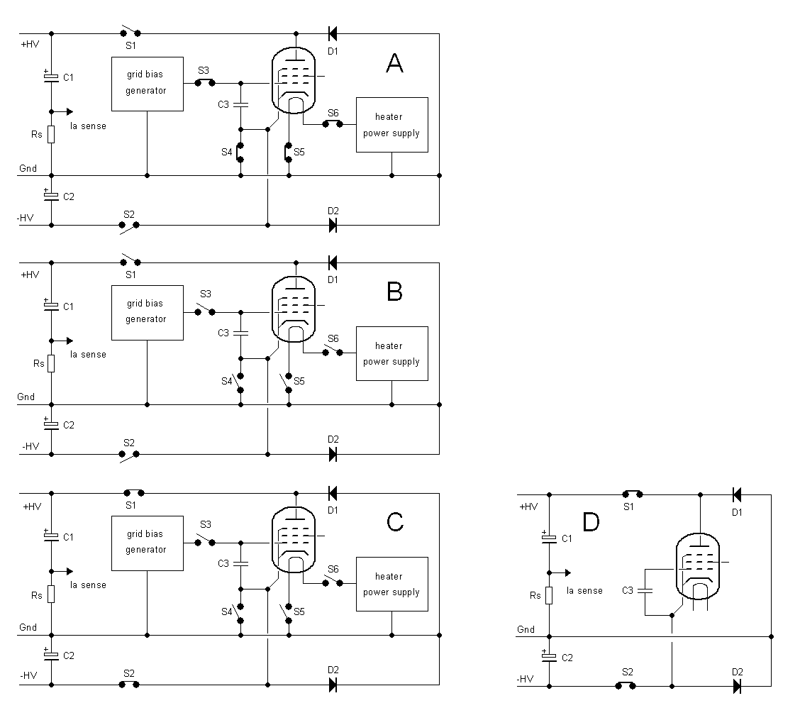 is shown in Fig. 1.1. The idea was to use two boost converters, a positive and a negative one, to obtain the double working voltage of what can be achieved with a single boost converter, so in total 800-900 V. In the standby situation (Fig. 1A) the heater is active and a grid bias capacitor is charges to the required grid bias voltage. Next S3 ... S6 are opened (Fig. 1B). The tube now becomes floating with respect to ground, but the control grid voltage is “remembered” by C3. During the actual (pulsed) measurement S1 and S2 are closed applying a positive bias to the anode and a negative bias (with respect to ground) to the cathode, the grid still being biased by C3 (Fig. 1C and 1D). Note that diodes D1 and D2 prevent reverse biasing of the high voltage switches beyond their working voltages.