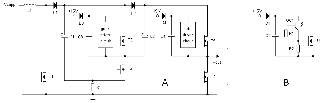 The very elegant scheme of Fig. 1.2 makes it possible to achieve double the voltage of the standard boost converter using only “standard” 450 V capacitors, but it doesn’t eliminate the need for a 900 V, or with a safety margin, 1000 V switching device. As discussed above, it is very difficult to find affordable PNP or PMOS devices for these working voltages. However, NPN and NMOS devices for these voltages are readily available. In general N-type devices require a more complex driver circuit because the gate voltage has to be controlled with respect to the source which is floating and even has to become higher than the high voltage rail when the device is fully on! As it turns out, for this application, also the P-type solution would require a special driver scheme to galvanically isolate the high voltage switch from the rest of the circuit, so in complexity there is not much difference. Finally we have to make the choice between an NPN bipolar transistor or an N-Channel MOSFET. Given the fact that for the MOSFET we don’t have to bother with a static gate current and that suitable high-voltage NMOS transistors are relatively cheap the choice was easy. At first sight suitable transistors are the FQD2N100 from Fairchild or the STD2NK100Z from ST Microelectronics. These transistors have an on resistance of resp. 9 and 6 ohm, more or less independent of the drain current, so that it is quite straightforward to compensate for the voltage drop over the transistor after the measurement.