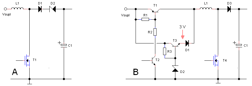 In the second method a second power supply s used with a very low voltage for example 2 V. Figure 2Bshows a circuit implementation of this idea. The very simple voltage regulator consisting of T3, R3 and D2 generates a voltage of approximately 3 V. For output voltages higher that the supply voltage T1 is switched on so that the boost converter is supplied directly by the 19.5 V power supply. For output voltages lower than the supply voltage T1 is switched off. The boost converter input voltage now drops to approx. 2 V. In this way it is possible to obtain output voltages as low as 2 V at the expense of some additional circuitry and two (also one for the screen supply) control lines.