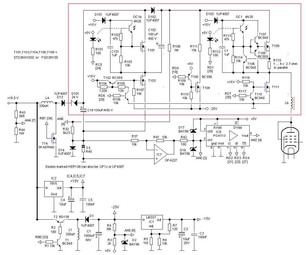 Figure 4.1 Shows the schematic of the test circuit. The part of the circuit in the red box is new, while the part of the circuit outside the red box has been taken directly from the uTracer3 with only a few modifications. In the first place the negative power supply has been lowered to -25V by lowering R4 to 30k. It is the idea to use a double grid supply in a new uTracer design with one grid supply for the +100 V to 100 V range, and a second simple supply for the 0 to -20 V range. The last range is generated by a single OpAmp and a negative supply voltage of -25 V is perfect for that. Additionally the -25 V is used to discharge the reservoir capacitors down to 0 V by means of T104. Here the combination of the +5 V and the -25 V supply just provide the voltages to control the gate of the MOSFET within the maximum gate voltage range. Note that this lower negative supply voltage makes it additionally possible to use a simple LM7915 for the -15 V supply. A second modification the uTracer3 board is that the tube is no longer referenced to the positive supply voltage but to ground!