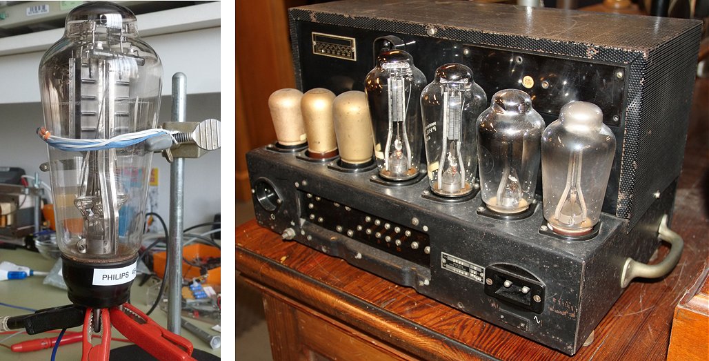 Figure 16-1 Left: The 4641 uses an oversized 4 pin socket to deal with the very high voltages. As I didn’t have one of those, I used some clips to connect the tube to the uTracer6. Right: A Philips 70 W class AB audio amplifier used in cinemas. The type number on the identification plate is 3760, but unfortunately, I could not find any further information on it. The amplifier is in the Historical Collection (“Studieverzameling”) of the Faculty of Electrical Engineering, Mathematics and Computer Science of the Technical University of Delft, the Netherlands. Visit their website and make a virtual tour through the museum which is completely run by volunteers! Photograph by Han Geijp.