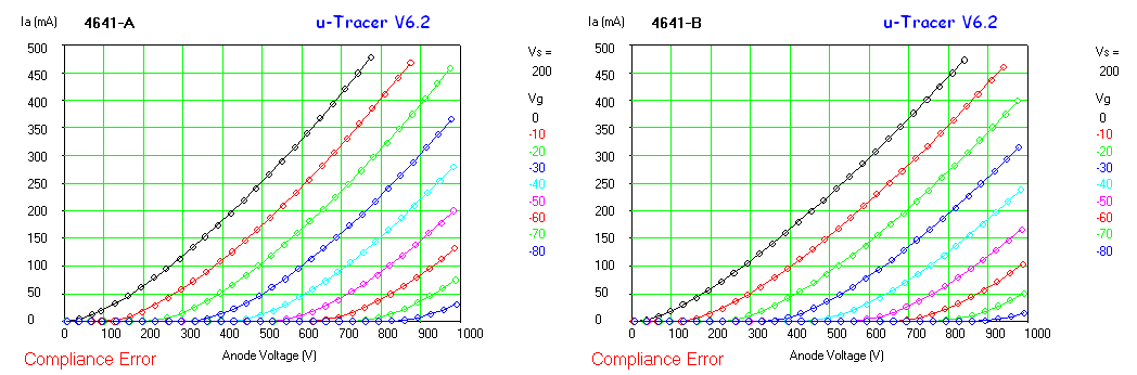 Figure 16-3 My two 4641 traced with the uTracer6. In this case the heater was powered by a transformer, making use of the new feature to AC power directly heated tubes introduced in the previous section. For this measurement I set the compliance to 480 mA, to not unnecessarily stress the filament. Of course, the notice “Compliance Error” is not really an error, but a message that the uTracer has skipped measuring the points above the set compliance value (480 mA). To speed up the measurement the range for the screen channel, which is of course not used, was set to maximum, avoiding unnecessary averages. Amazingly, although I can only trace the tube to 1000 V, it apparently is still - after almost 90 years - in tiptop shape!