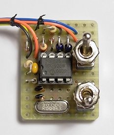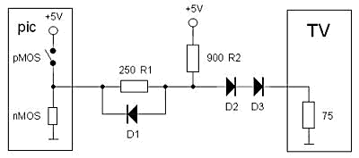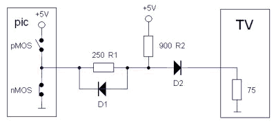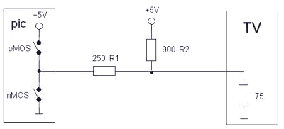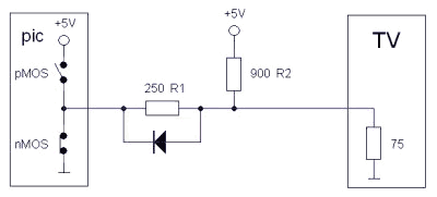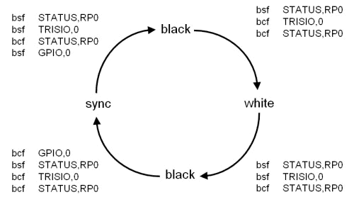For the generation of the video signal commonly 2 outputs are used. One for the video signal and one for the synchronization pulses. The µPONG project almost found a premature end when I discovered that I was short of one output. Of the 8 pins from the 12f675, 2 pins are needed for power, 2 pins are connected to the crystal and 2 pins are used to read out the potentiometers. This leaves 2 pins. To my surprise I learned from the datasheet that pin 4 (GP3) can only be used as a digital input. This leaves just one general purpose I/O pin that can be configured as output.